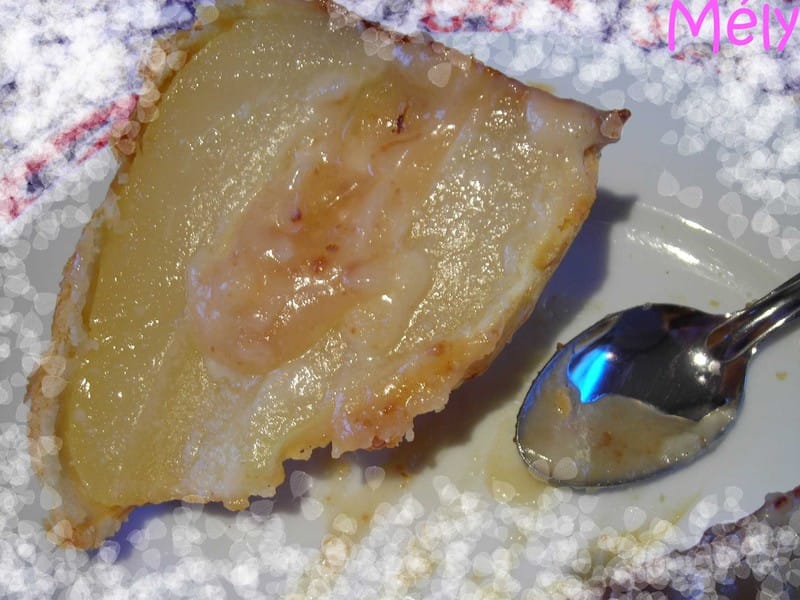 La 1er poire, je l’ai coupée en 2, dans le sens de la hauteur (elle n’a pas tiédi, ma mère voulait la manger tout de suite !), donc le coeur est très coulant.