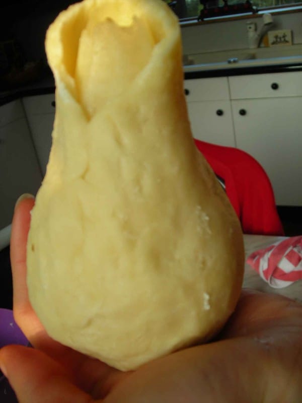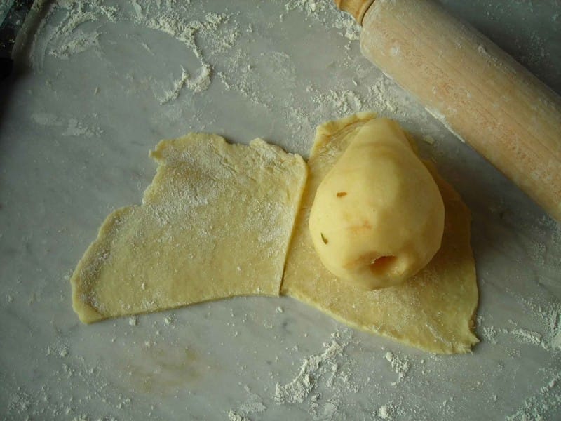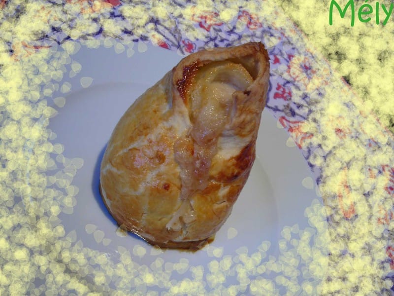 Puis, enrobez votre poire avec le morceau de pâte découpée (attention, laissez le haut de la poire dégagée !)