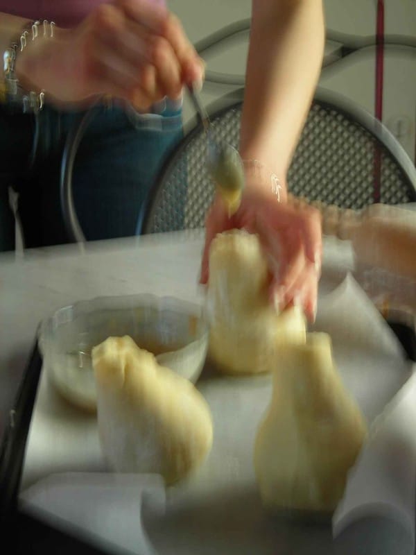 Les placer ensuite sur une tôle avec du papier sulfurisé, et les badigeonner, à l’aide d’un pinceau à pâtisserie, d’un jaune d’oeuf.