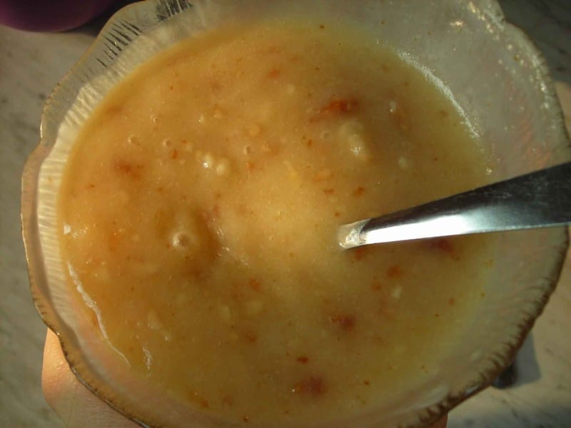 La pâte d’amande est devenue molle. Ajoutez la crème fraiche, et mélangez (il y a des petits morceaux, ce n’est pas grave).
