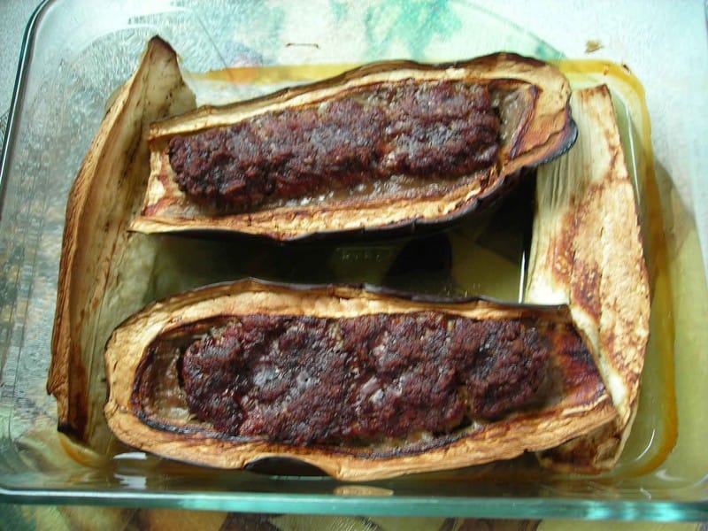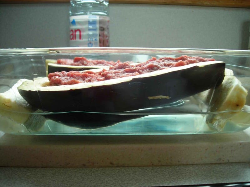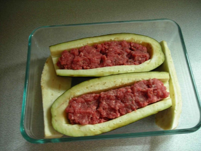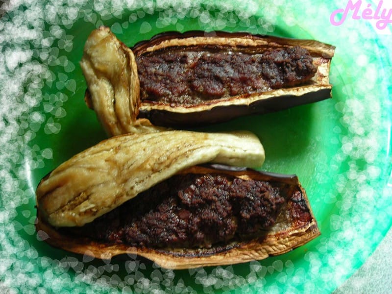 - Farcir les 2 moitiés d’aubergine avec votre viande hachée.