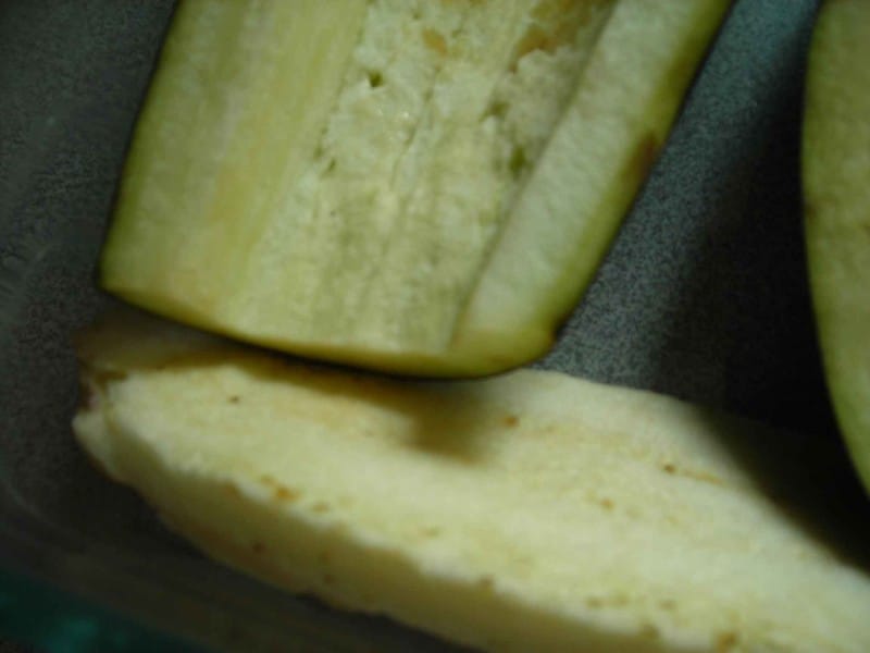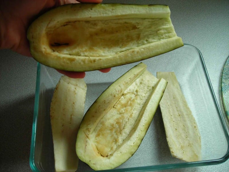 Placez vos 2 moitiés d’aubergines dans le plat, dans le sens de la longueur.