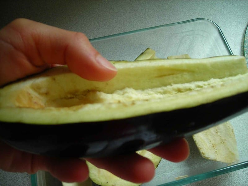 - A l’aide d’un couteau, découpez l’intérieur de l’aubergine, son contour (cf photo). Puis, à l’aide d’une petite cuillère, évidez là (gardez les 2 moitié de coeur !).