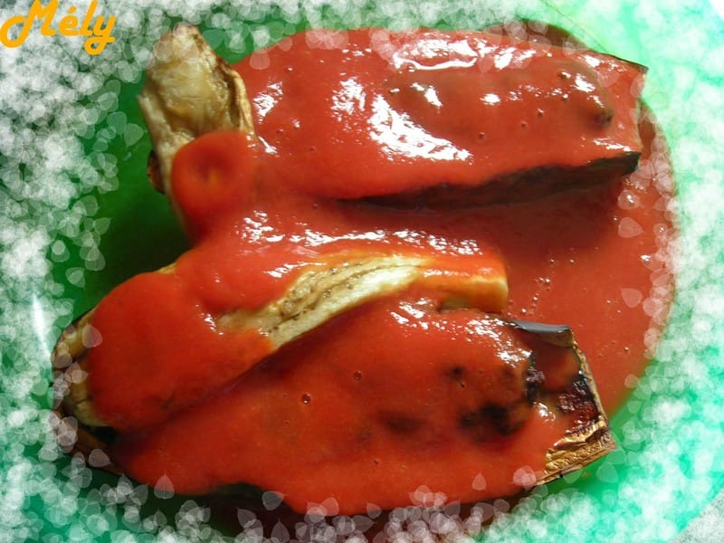 - Retirez votre aubergine farçie du plat, et mettez dans une assiette. Versez le coulis chaud sur votre aubergine.