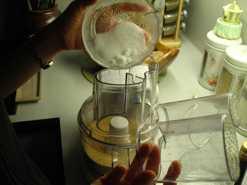 - A l’aide d’un robot mixer, mixer les biscuits, le beurre fondu et les 50 ml de sucre.