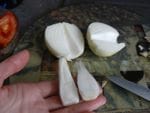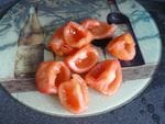 - Coupez vos tomates en 4. Enlevez les « bouts » (je ne sais pas comment ca s’appelle, cf photo).