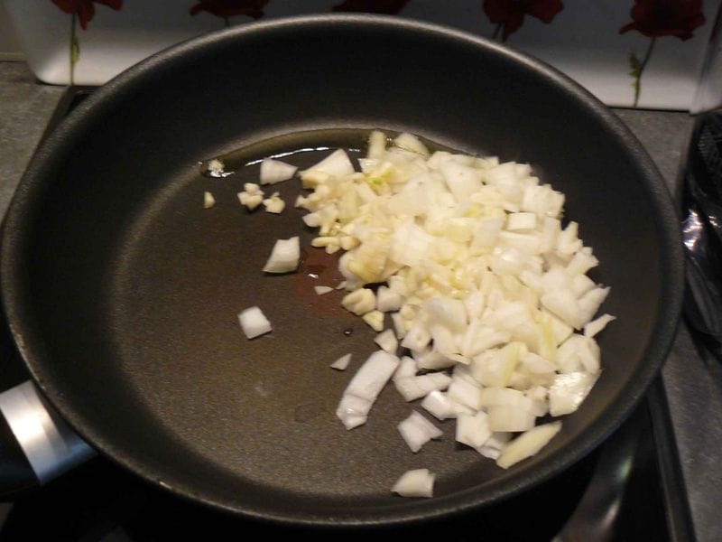 - Dans une poële : versez la c. à c. d’huile d’olive, et faites revenir les dés d’oignon + l’ail haché.