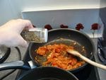 - Ajoutez : le concentré de tomates, le vinaigre balsamic, puis 5 cl de bouillon de légumes (volaille dégraissé pour moi) (désolée, pas de photos), et le basilic.