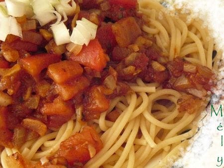 Il s’agit d’une recette de pâtes servies avec une sauce à base de légumes (dominance tomates).