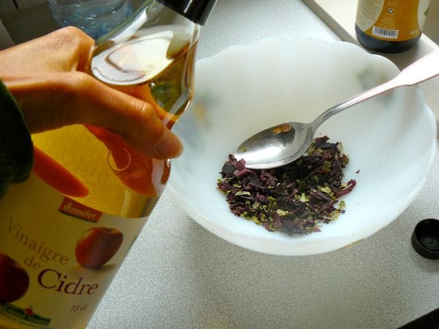 1. Dans un saladier, versez les algues séchées, le vinaigre & l’huile (le temps de préparer le reste, les algues se ré-hydratront).