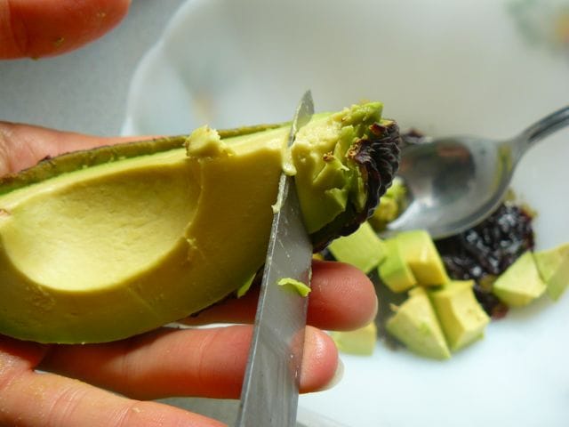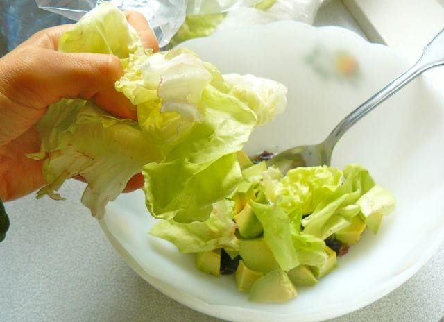 4. Découpez votre avocat en dés, ajoutez les feuilles de salades & le thym.