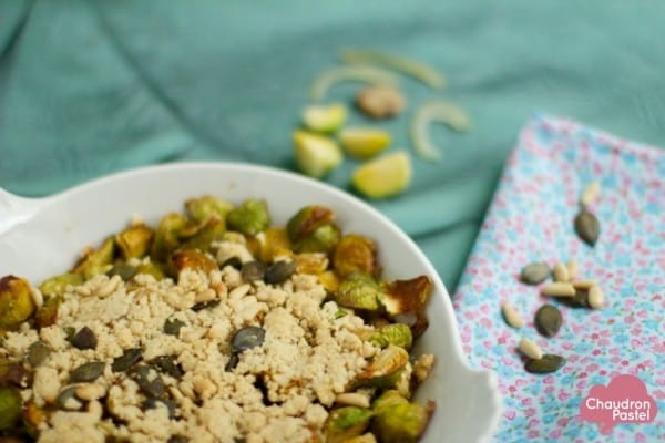 - Versez votre mélange de pâte à crumble par dessus vos choux de Bruxelles, et tassez légèrement à la main.
