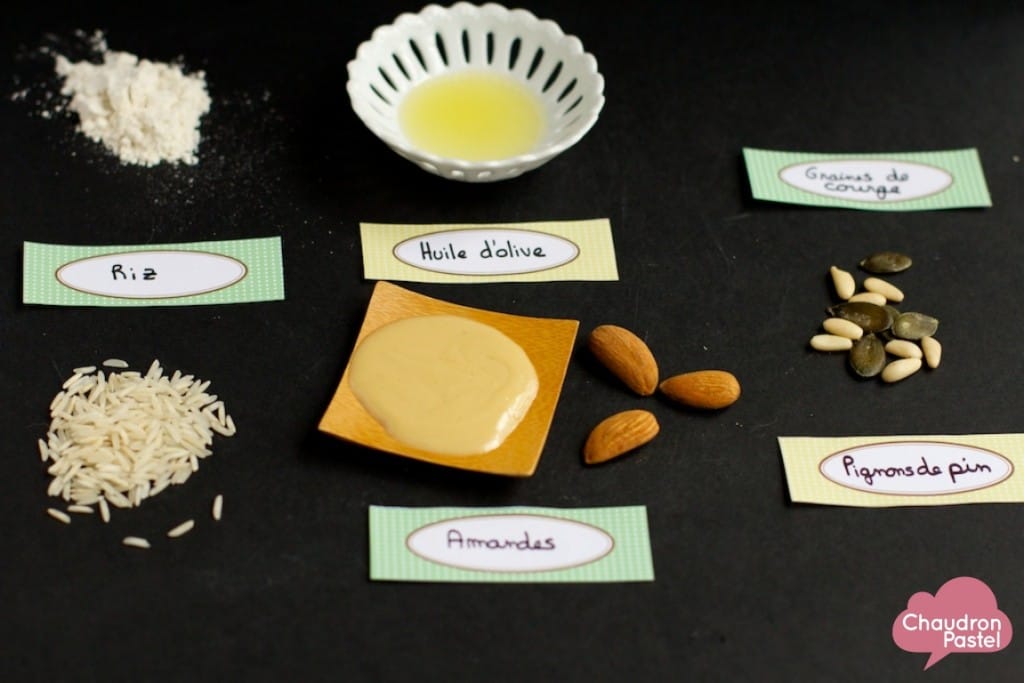 L’huile d’olive & la purée d’amandes blanches se conservent aussi facilement chez soi. Il suffit d’en avoir sous le coude.